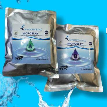 After understanding the advantages and implementation related problem of conventional disinfection system (handling and transportation, dosing application, residual effect, health hazards, safety and infrastructure cost), Envocrystal has evolved a unique disinfection technology Microslay ClO2 (certified by National Sanitation Foundation under The Public Health and Safety Organization USA). Microslay ClO2 is a transportable, non-explosive powder kit of two component that, once added to a specific volume of water, reacts fully into a long lasting active Microslay ClO2 solution with a concentration of 0.6%. It is an oxidizing biocide. Microslay ClO2 is an advanced delivery system to generate Chlorine, dioxide with a purity of 99.9+%. Microslay 6000 does not generate any carcinogenic by products and chlorinated hydrocarbon (THMs, TCMs, CFCsetc). The active biocide Microslay V is 10 X more powerful than Chlorine (and Chlorine type disinfectants), works at a board pH range from 4 to 10, with a stable efficiency on variable temperature range.